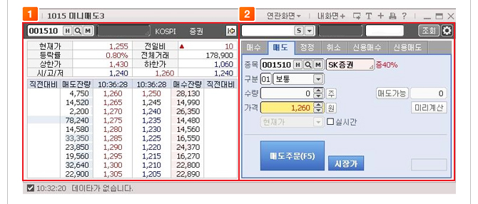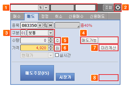 “매도주문(F5)”는 주문화면에서 설정한 주문구분 및 주문가격에 따라 주문이 실행됩니다. 반면에 “시장가매도”는