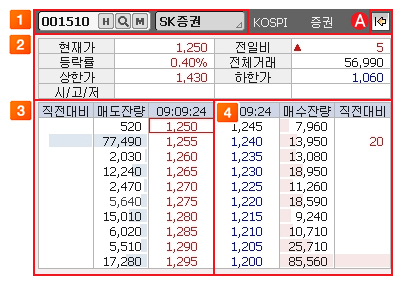 해당종목의 호가를 10단계까지 확인 할 수 있으며 각 호가에 대한 잔량과 직전대비 증감, 감소를