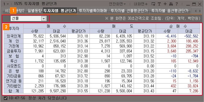 [1575]투자자별 평균단가 개인, 외국인, 기관계 선물업자, 기타, 전체 등 평균단가를 시장별로 조회하여 보실 수 있는 화면입니다. 선물, 콜옵션, 풋옵션 등 시장별로 조회하실 수 있습니다. 투자자별로 해당 정보를 확인하실 수 있습니다.
