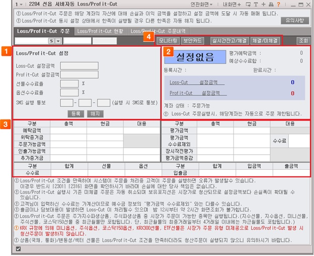 Loss/Profit-Cut화면은 서버저장 되므로 설정 후 화면을 닫거나 HTS를 종료해도 정상실행이 되니 유의하시기