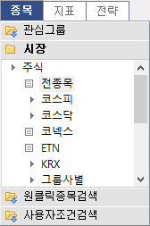 차트화면 좌측에 위치하며 3 개의 탭으로 구성되어 있습니다. 종목탭은 종목선택, 관심등록, 돌려보기 등의 기능으로